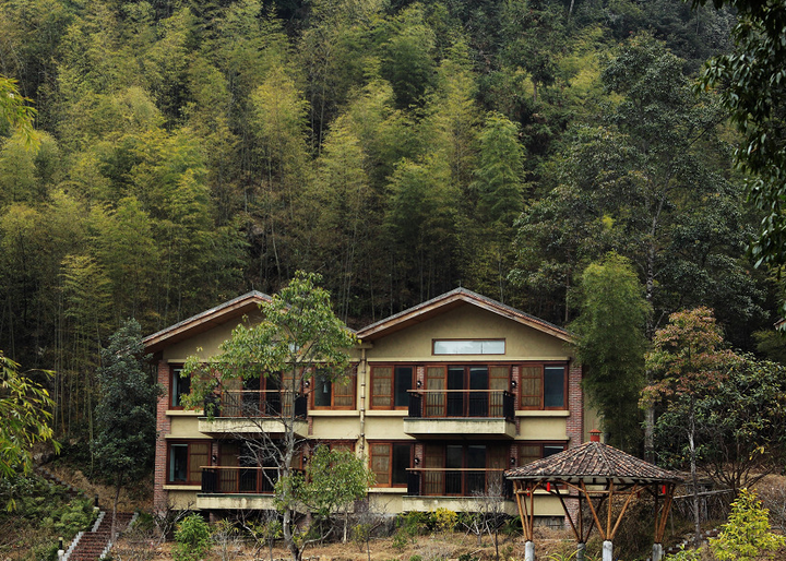 十字水生態(tài)度假村座落于廣東省腹地、南昆山國家森林公園內(nèi),占據(jù)了雙溪交匯處的2500余畝谷地,建筑面積卻不超過1萬平方米。嚴(yán)格控制建筑密度,再加上大量使用青黃瓦和夯土墻等傳統(tǒng)建筑材料,從盤山公路上透過層層翠竹俯瞰,掩映于山水間的十字水完全是一個疏密有致的客家村落,屋前溪流、房后竹影。