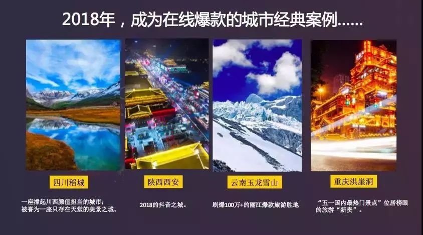 2018年,這樣成為在線爆款的城市及旅游目的地經(jīng)典案例還有很多,比如四川稻城、陜西西安、云南玉龍雪山、重慶洪崖洞等。